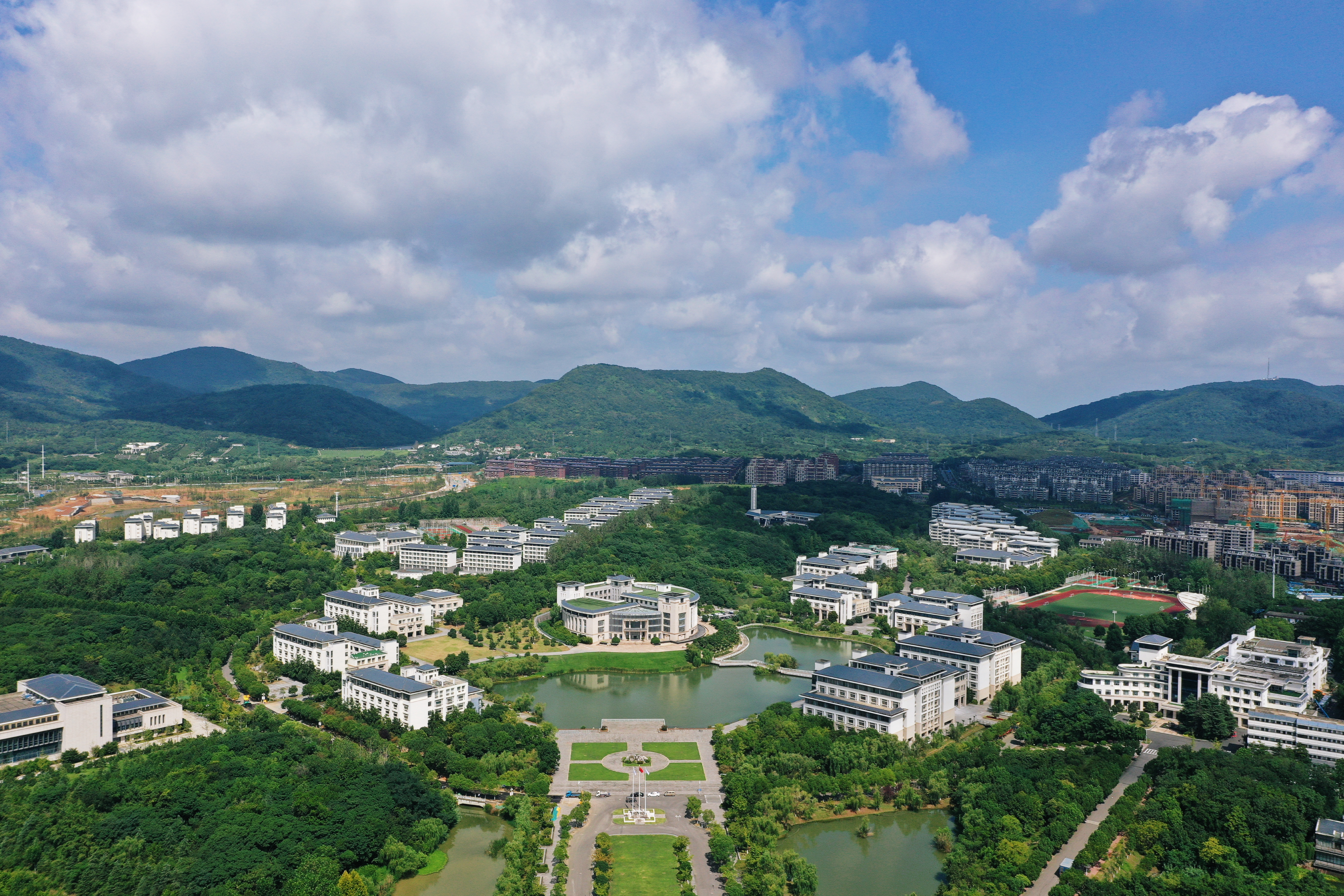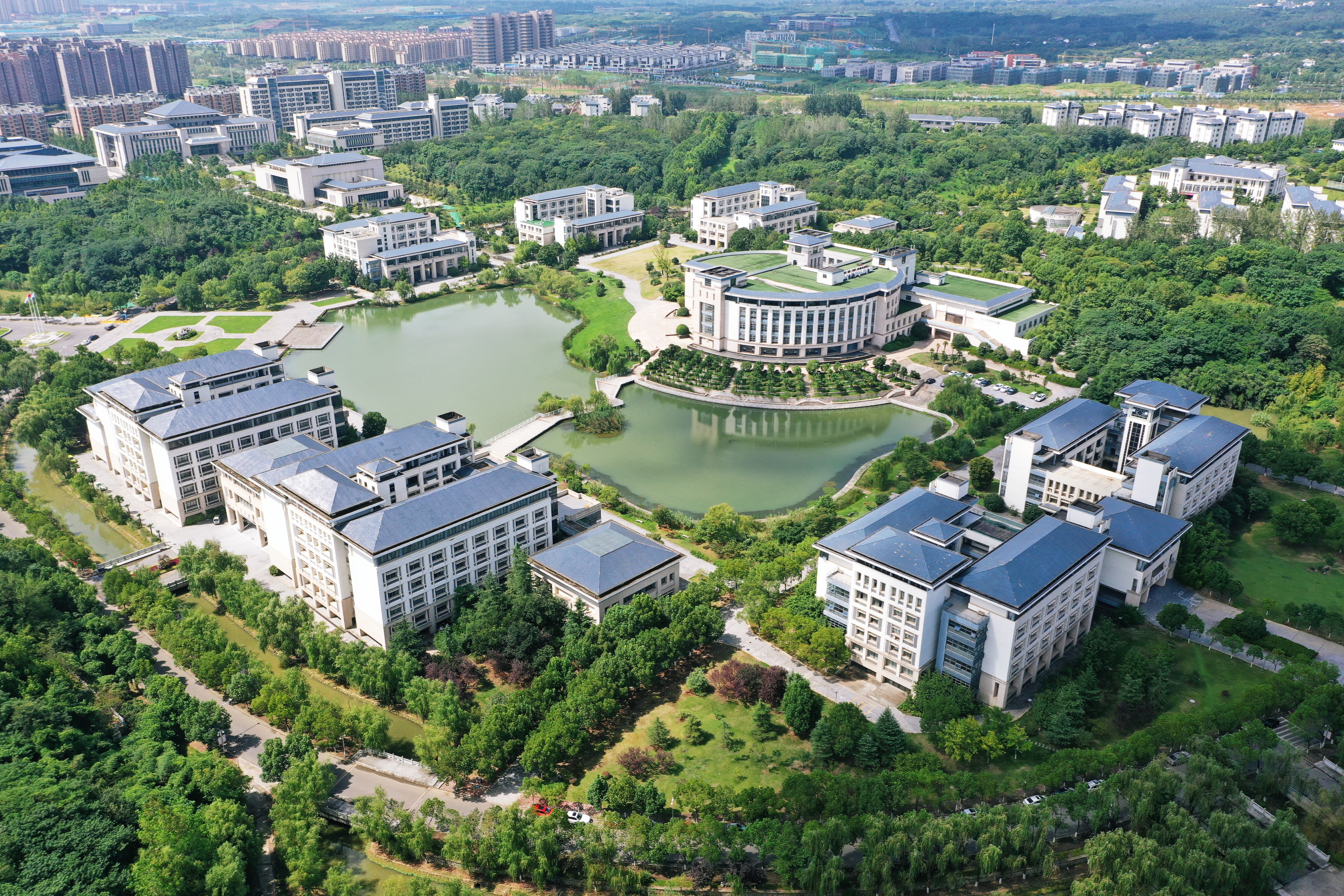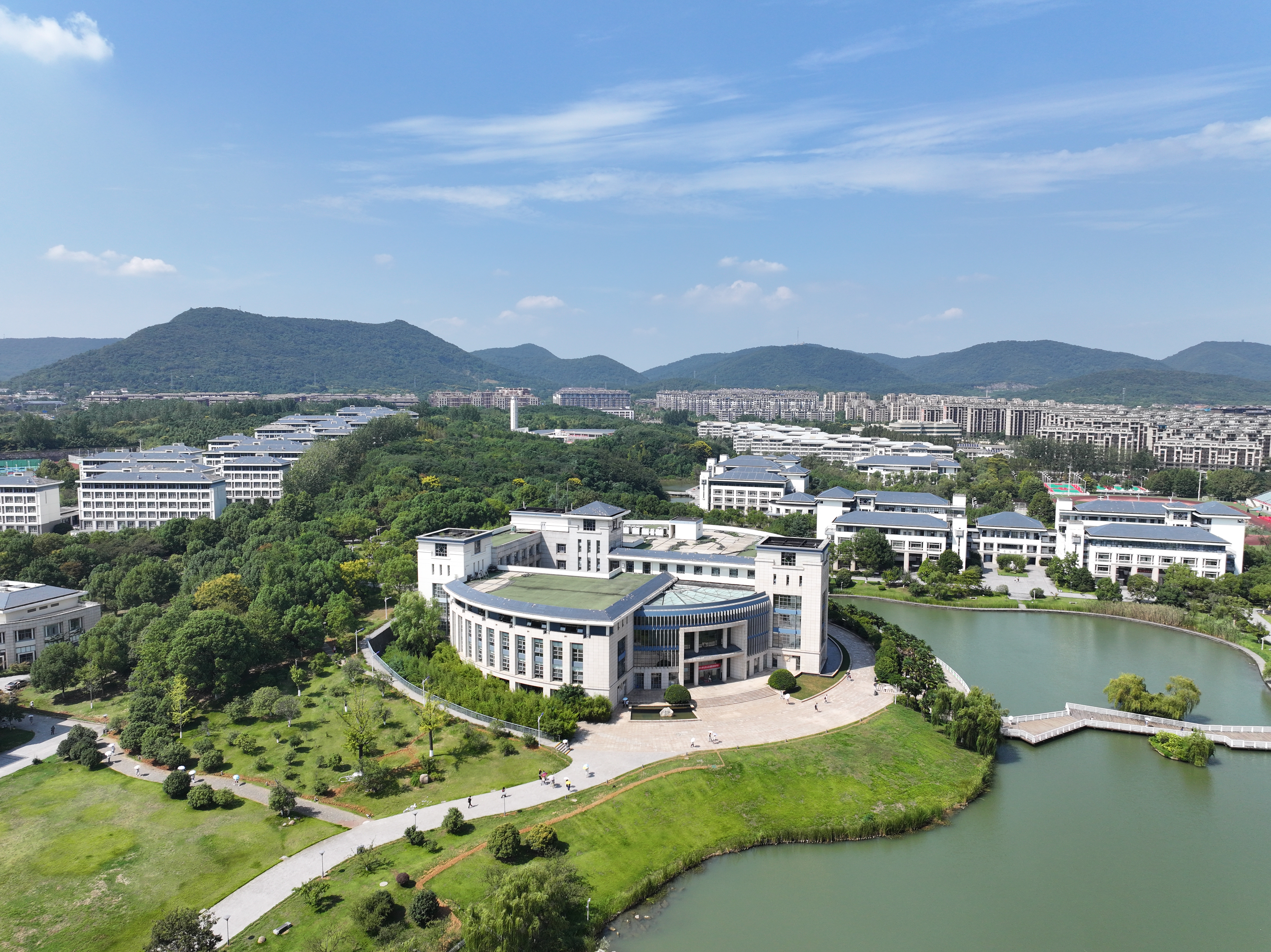 取形方正,屋顶取山黛之色,外墙取阳光之感,色调搭配追求庄重典雅,新校区的单体采取新古典主义风格,突出借鉴民国建筑,顶、檐、廊、柱这些中国传统的建筑元素在运用了西方常见的石料、金属、玻璃的材料加以表达之后,新校区的建筑获得了新的生机,在这里中国文化与世界文化得到了和谐融合,南审办学理念中的“特色”与“国际化”在此又有了一种建筑表达。
