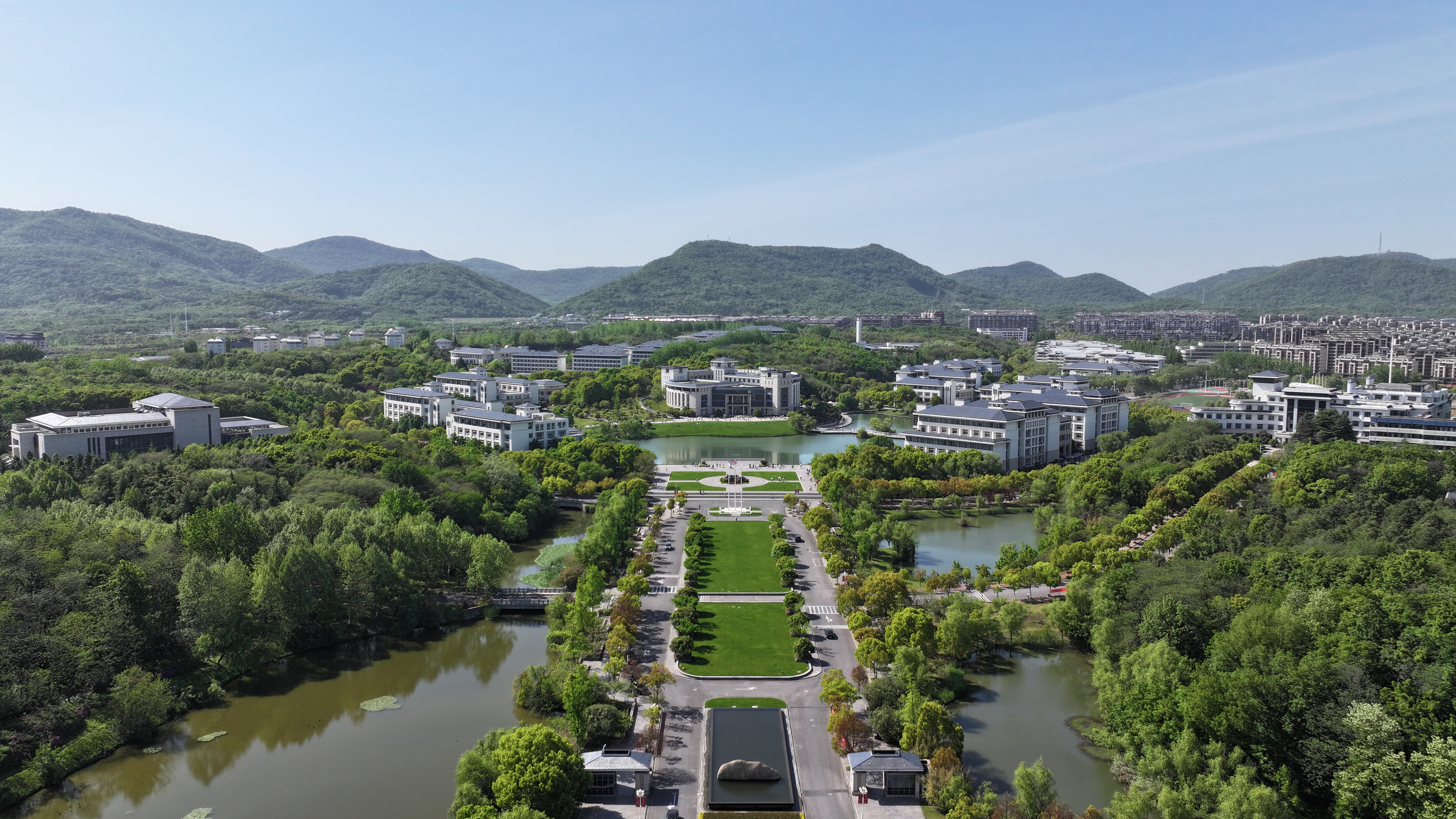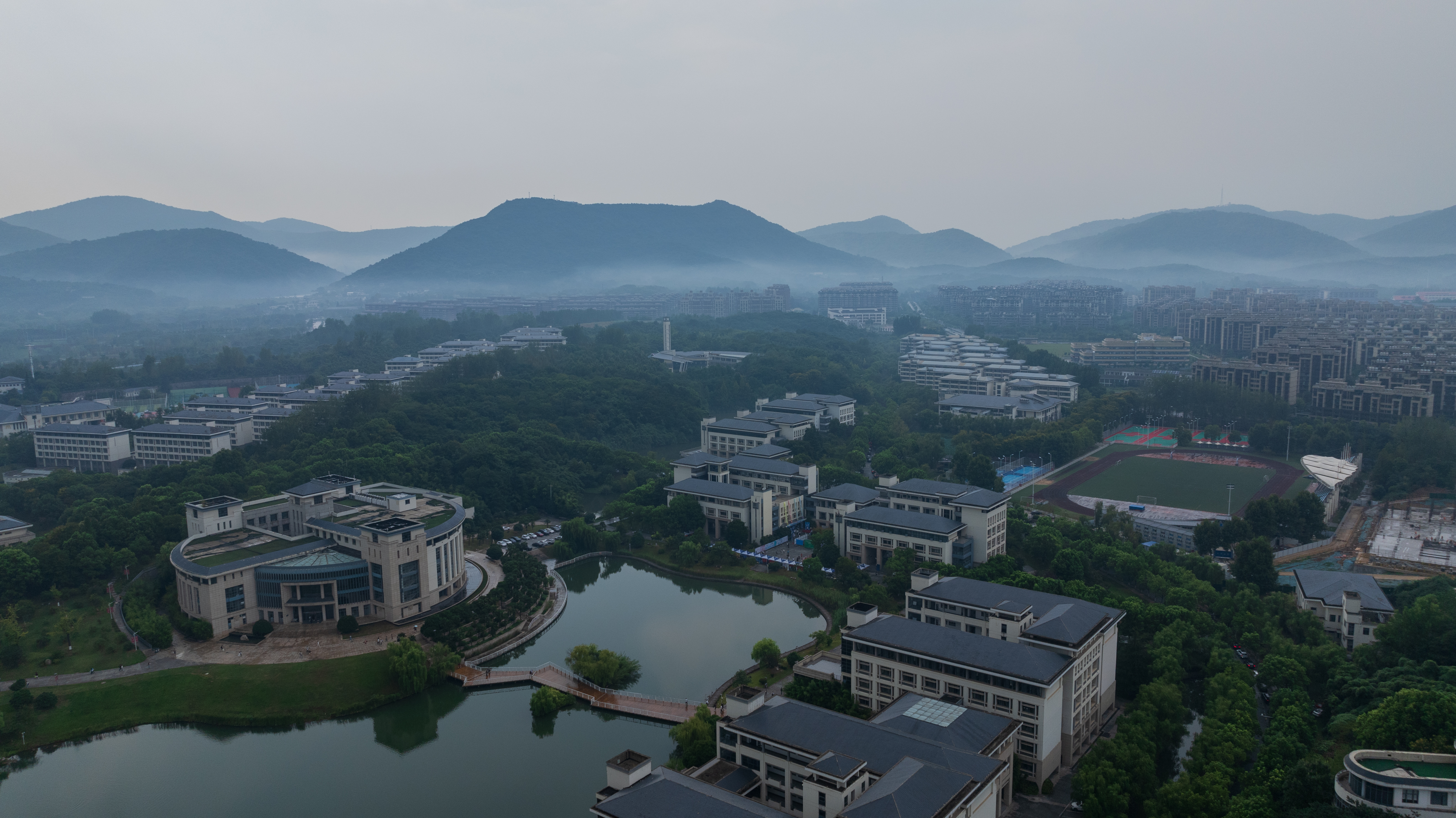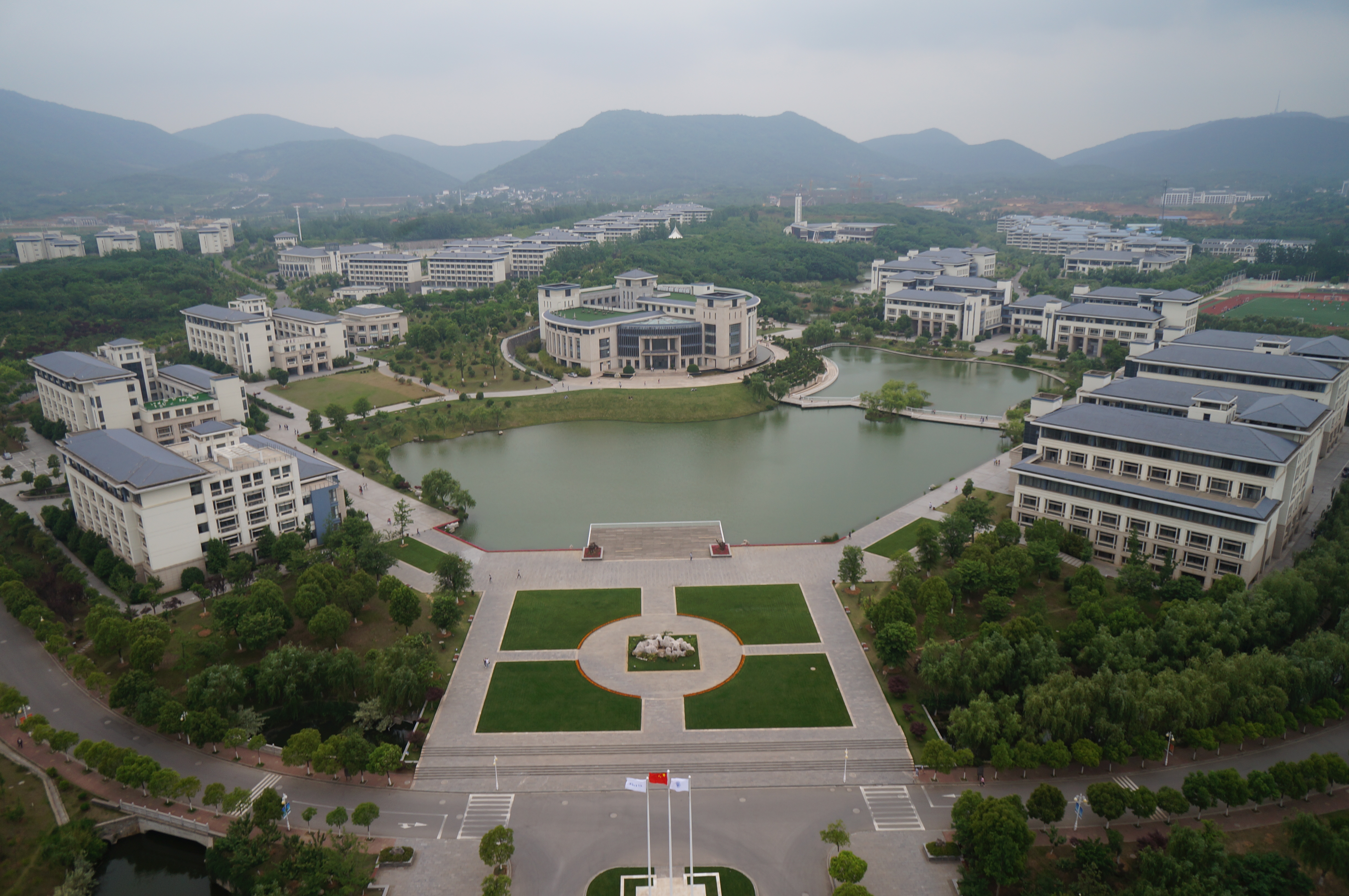 取形方正,屋顶取山黛之色,外墙取阳光之感,色调搭配追求庄重典雅,新校区的单体采取新古典主义风格,突出借鉴民国建筑,顶、檐、廊、柱这些中国传统的建筑元素在运用了西方常见的石料、金属、玻璃的材料加以表达之后,新校区的建筑获得了新的生机,在这里中国文化与世界文化得到了和谐融合,南审办学理念中的“特色”与“国际化”在此又有了一种建筑表达。