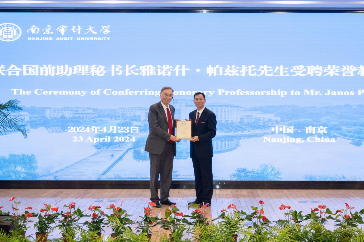 董必荣为联合国前助理秘书长雅诺什·帕兹托颁发荣誉教授聘书、佩戴校徽、赠送纪念品。