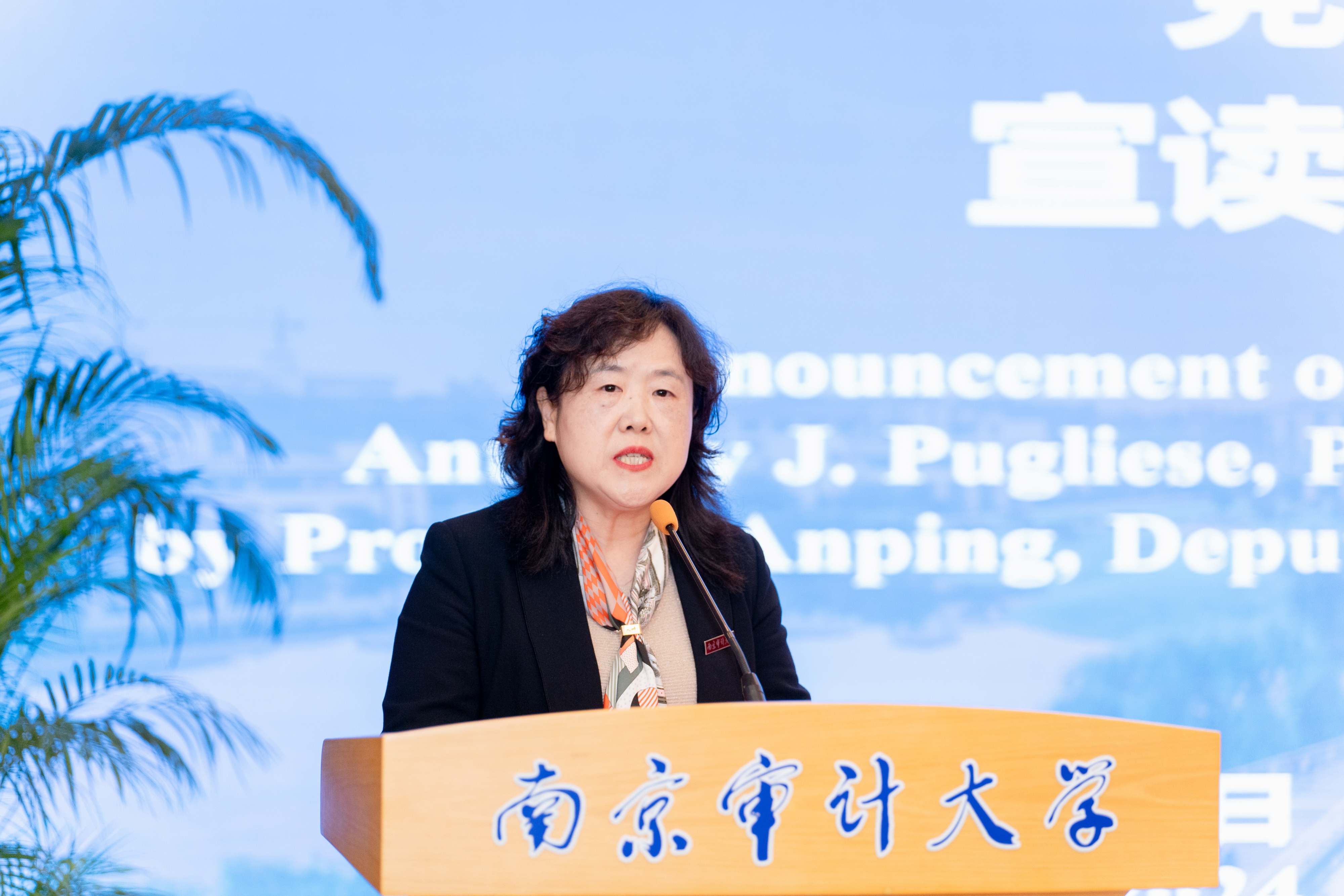 校党委常委、副校长卢亚娟宣读《关于授予国际内部审计师协会秘书长兼首席执行官安东尼·普耶兹先生荣誉教授学衔的决定》。