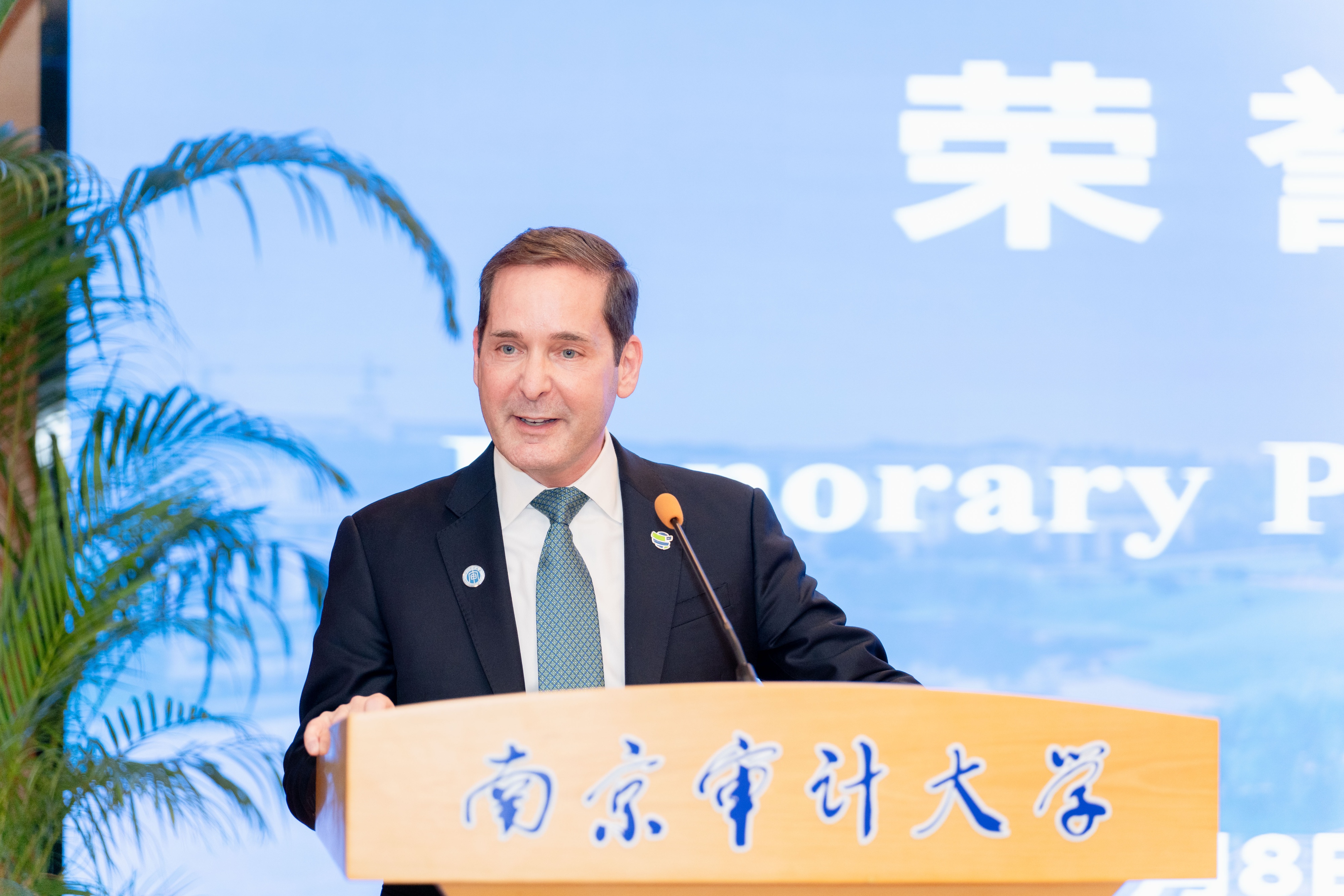 董必荣在致辞中代表全体师生向安东尼·普耶兹先生受聘担任beat365荣誉教授表示感谢。他指出,近年来南审与包括联合国系统在内的多家国际组织、行业组织建立了广泛的合作关系,与国际内部审计师协会友谊深厚。安东尼·普耶兹秘书长及沈立强秘书长一行的访问,为我们三方的友好关系与交流合作开启了新篇章,同时也为南审师生带来了国际内部审计领域的最新理念、宝贵经验和宽广视野。希望安东尼·普耶兹的加入为beat365vip官网登录入口的教学、科研和国际交流带来新的机遇和动力,为南审师生开启一扇通向国际内部审计前沿的窗户,促进双方在学术领域的深度交流与合作。