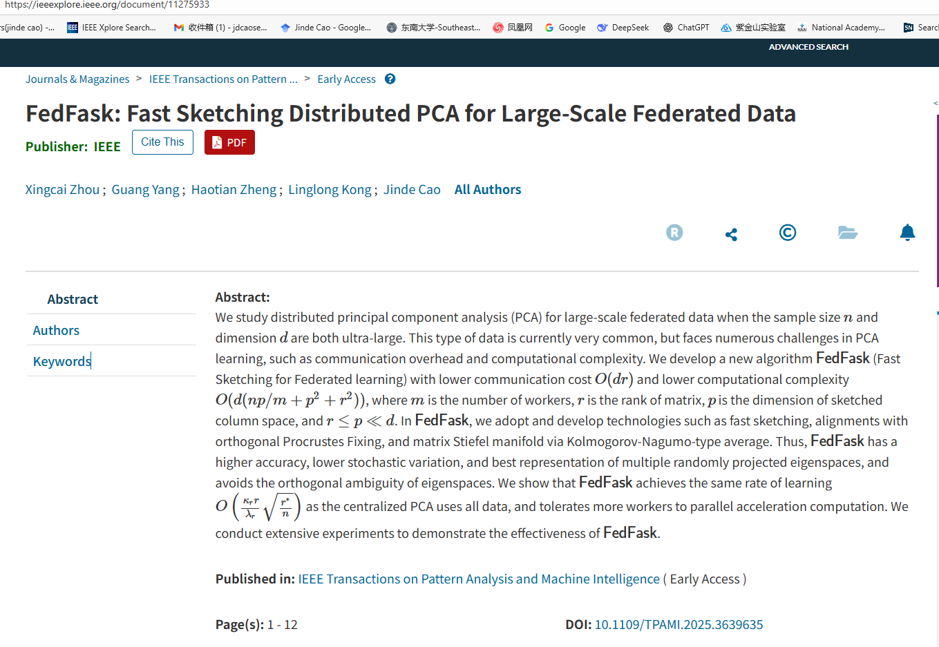 Xingcai Zhou, Gang Yang (博士生), Haotian Zheng (硕士生), Linglong Kong & Jinde Cao. FedFask: Fast Sketching Distributed PCA for Large-Scale Federated Data. IEEE Transactions on Pattern Analysis and Machine Intelligence, 2025+, https://doi.org/10.1109/TPAMI.2025.3639635